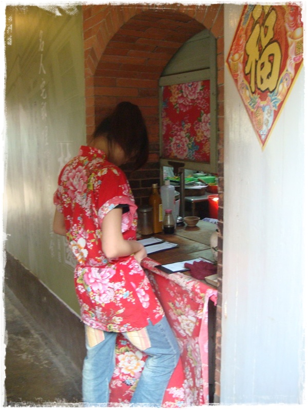 不只是桌巾而己, 那裏的工作人員身上都穿著阿嬤花布做的衣服,